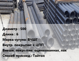 Труба чугунная 500 L=6 Чугун:ВЧШГ с ЦПП *оцинкованная, лак Тайтон, шт цена от 104 756 Тг / шт, где купить, условия доставки в Уральске и Западно-Казахстанской области