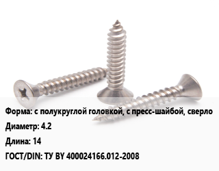 Саморез с полукруглой головкой, с пресс-шайбой, сверло D=4.2 L=14 ГОСТ: ТУ BY 400024166.012-2008