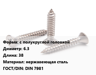 Саморез с полукруглой головкой D=6.3 L=38 нержавеющая сталь ГОСТ: DIN 7981