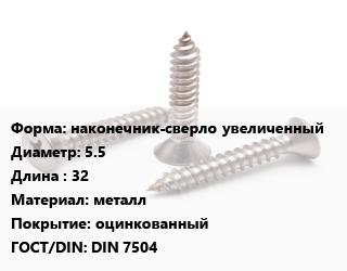 Саморез наконечник-сверло увеличенный D=5.5 L=32 металл оцинкованный ГОСТ: DIN 7504