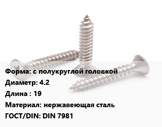 Саморез с полукруглой головкой D=4.2 L=19 нержавеющая сталь ГОСТ: DIN 7981