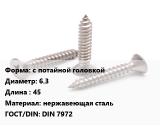 Саморез с потайной головкой D=6.3 L=45 нержавеющая сталь ГОСТ: DIN 7972