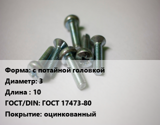 Винт с потайной головкой 3х10 ГОСТ 17473-80 оцинкованный