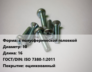 Винт с полусферической головкой 10х16 ISO 7380-1:2011 оцинкованный, 10.9, цена за шт, кг цена от 35.1 Тг / кг, где купить, условия доставки в Уральске и Западно-Казахстанской области