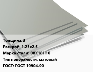 Лист нержавеющий 3 1.25х2.5 Сталь: 08Х18Н10 Тип:матовый ГОСТ 19904-90